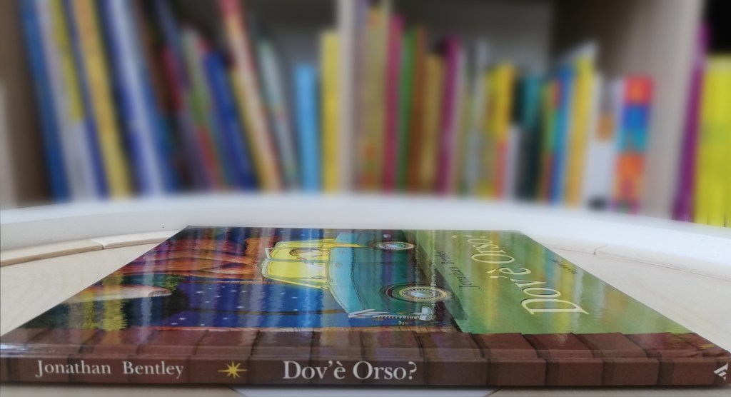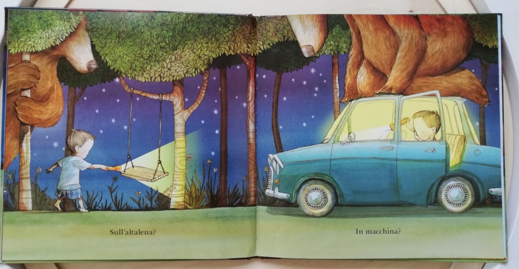 Un bimbo cerca Orso ma non lo trova. Eppure è lì vicino a lui, noi lo vediamo, un grande orso che accompagna il bimbo nella sua perlustrazione dentro e fuori casa. Niente da fare, il bimbo continua a cercare dappertutto ma non si accorge del grande bestione che lo segue ovunque. Alla fine, felicissimo, lo trova: ma chi è questo Orso quindi? 😊