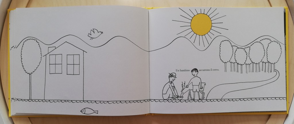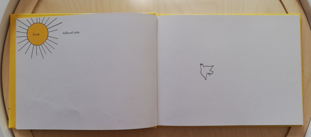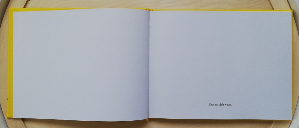 Tutto inizia con un foglio bianco che reca una breve didascalia: Ecco un cielo vuoto. Voltata la pagina, nel cielo vuoto compare un uccellino, poi il sole. Man mano le pagine si riempiono di nuovi elementi del paesaggio, come le colline, un albero, un fiume, e di personaggi, un papà con il suo bambino, che tratteggiano una scenetta essenziale ma in cui poter stimolare la capacità di osservazione dei bimbi, richiamando la loro attenzione su piccoli dettagli: il sole che si muove nel cielo, il pesce che nuota verso una direzione ma che è costretto a tornare indietro a causa di una barca che sta sopraggiungendo.