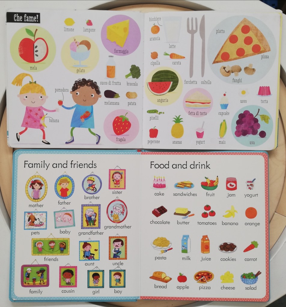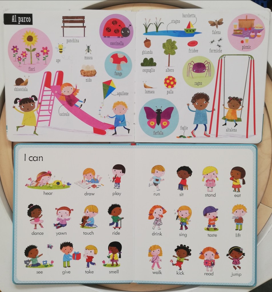 Una di queste buone pratiche è nominare con chiarezza gli oggetti quando sono portati all’attenzione del bambino. I libri nomenclatura fanno un po’ la stessa cosa, quando il bambino inizia a farsi più grandicello. Con il mio bimbo ho iniziato a sfogliare questi libri a partire dai 12 mesi, sia in italiano che in inglese, e li abbiamo sfruttati in abbondanza. Si tratta di Prime paroline della casa editrice Edibimbi e di My First Word Book di Usborne. Devo dire che quello italiano è più completo, comprende molte più categorie, ma quello inglese inserisce anche una pagina sui verbi molto utile. Per i genitori interessati a esporre il proprio bimbo alla lingua inglese fin da subito, credo sia comodo averli entrambi.